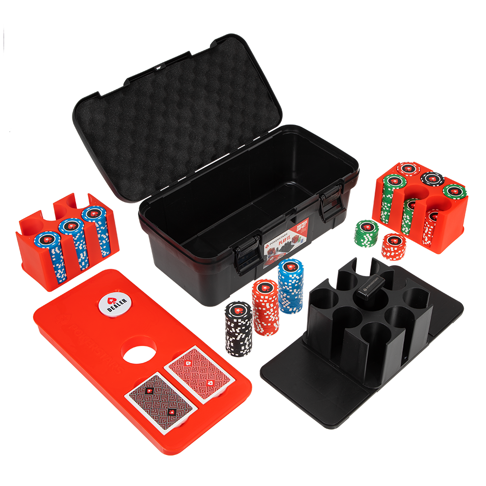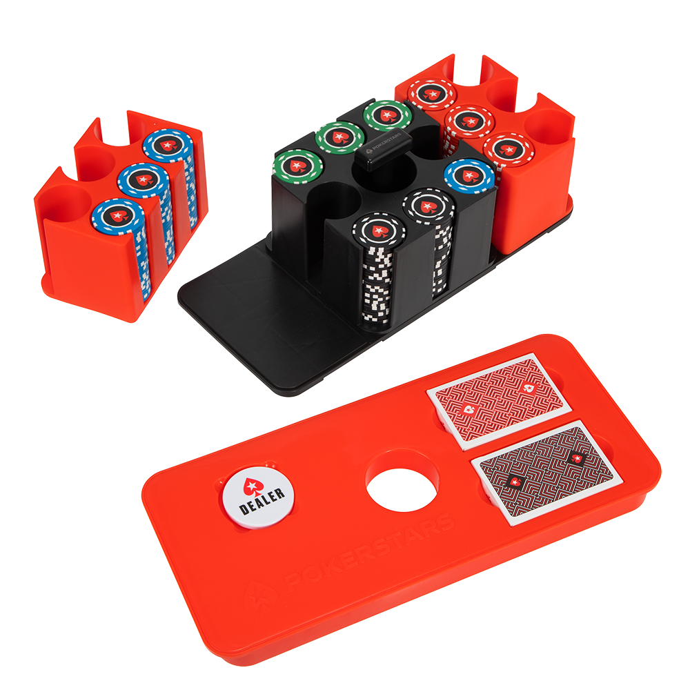 Whether you want to nip round to your mates or play a few hands on vacation, this On-The-Go chip set is a must-have for any poker enthusiast. Includes a dealer button, two playing card decks, three chip racks, an upper tray and 300 clay chips (no denominations).