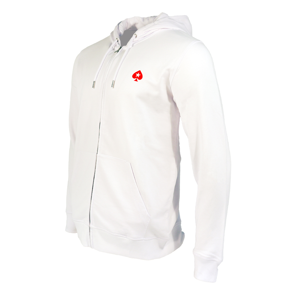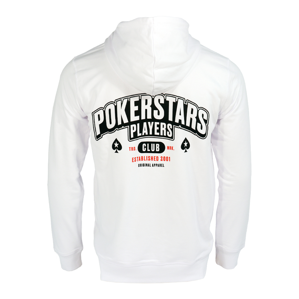 Stay warm in style with this white zipped Players Club hoodie. Featuring a medium fit with set in sleeve, plus herringbone tape in the inside back neck and inside of the zipper for added snugness. The iconic PokerStars Players Club logo is emblazoned across the chest, and the hoodie also includes a kangaroo pocket with flatlock topstitch.Also available in black.