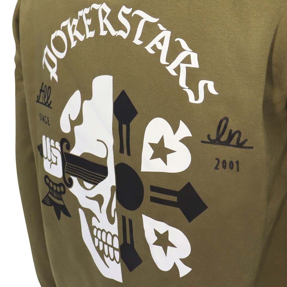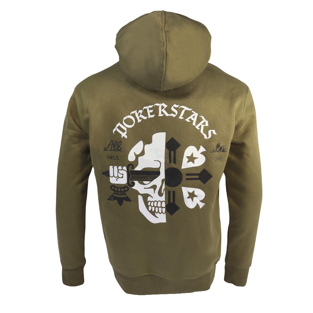 This khaki overhead hoodie brings an alternative look to the tables, but retains classic PokerStars style. Featuring a striking skull and sword design on the left chest and back, the hoodie also includes polished eyelets and drawcord ends, kangaroo pocket, waffle knit hood and a brushed fleece inner for added comfort.